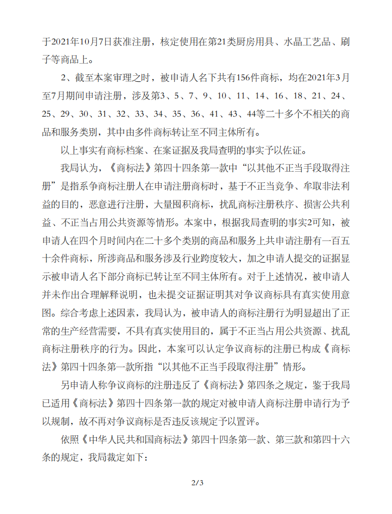 国家知识产权局认为,被申请人的商标注册行为明显超出了正 常的生产经营需要,不具有真实使用目的,属于不正当占用公共资源、扰乱 商标注册秩序的行为。因此,本案可以认定争议商标的注册已构成《商标 法》第四十四条第一款所指“以其他不正当手段取得注册”情形。
