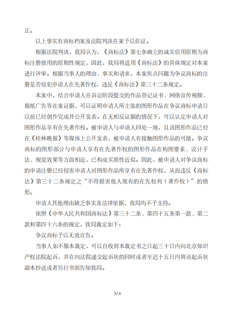 国家知识产权局经审理认为,争议商标的图形部分与申请人享有在先著作权的图形作品在构图要素、设计手法、视觉效果等方面相近,已构成实质性近似。因此,被申请人对争议商标的申请注册已经侵害申请人对图形作品所享有在先著作权,从而违反《商标法》第三十二条规定之“不得损害他人现有的在先权利(著作权)”的情形。国家知识产权局裁定:争议商标予以无效宣告。