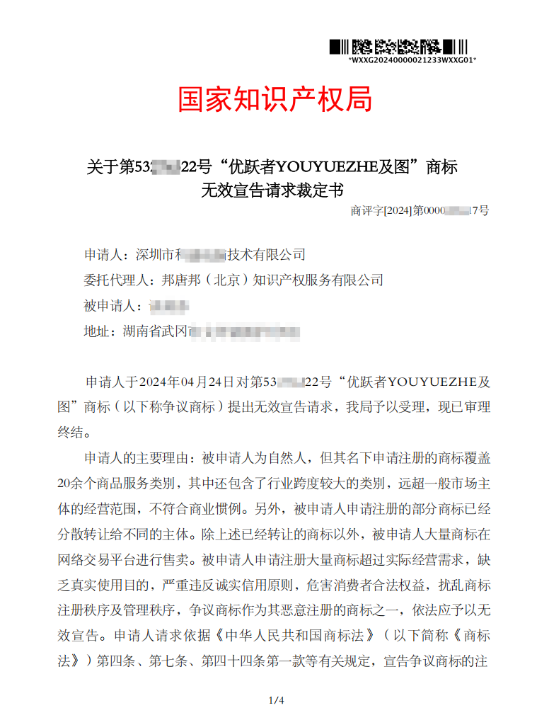 申请人委托我司(邦唐邦(北京)知识产权服务有限公司)对第53****22号“优跃者YOUYUEZHE及图”商标(下称争议商标)提出无效宣告请求,国家知识产权局予以受理。