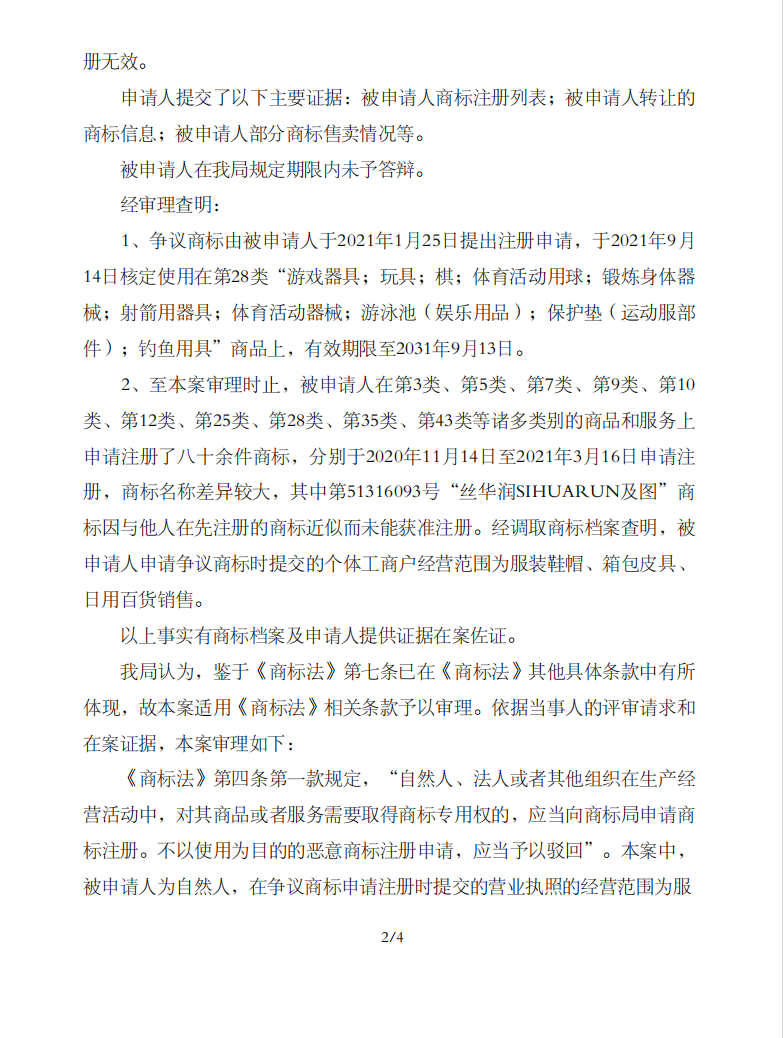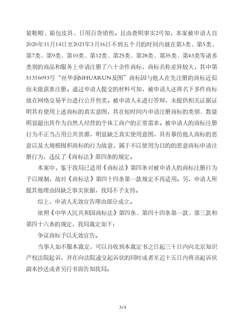 国家知识产权局经审理认为,被申请人的商标注册行为不正当占用公共资源,明显缺乏真实使用意图,具有摹仿他人商标的恶意以及大规模囤积商标的行为故意,属于不以使用为目的的恶意商标申请注册行为,违反了《商标法》第四条的规定。故裁定:争议商标予以无效宣告。